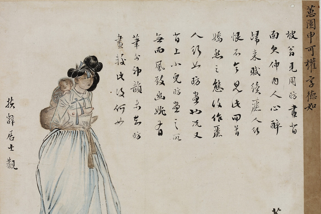 그림엔 아기업은 여인보다 더 넓은 여백을 차지한 긴 글이 쓰여있다. 부설거사扶辥居士가 쓴 글인데 그 인물에 대한 정보는 전혀 없다. <아기업은 여인>과 함께 구매한 <투계>에도 부설거사의 글이 있지만 역시 그가 누군지는 알려지지 않았다. 글은 신윤복의 출중한 그림 솜씨를 당대唐代의 화가 주방周昉의 그림에 빗대어 썼다.