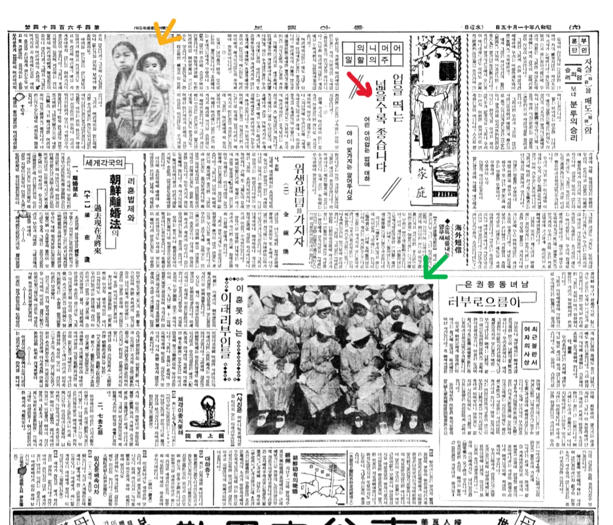 신문은 그날의 뉴스 뿐 아니라 연예, 생활, 스포츠, 정치, 사회, 문화 등등 각 지면마다 전문 기사들을 싣는다. 옛 동아일보 기사를 불러온다. 1933년 11월 15일자 신문 6면을 보면 어떻게 아기를 업는지 사진을 곁들여 친절한 안내를 한다. “어머니의 주의할 일, 업을 띄는 넓을수록 좋습니다, 어린아이 업는 법에 대하여 이 몇 가지는 알아두시요[寫] “ 이런 타이틀의 기사이다. “띄”는 “띠”를 뜻한다.
