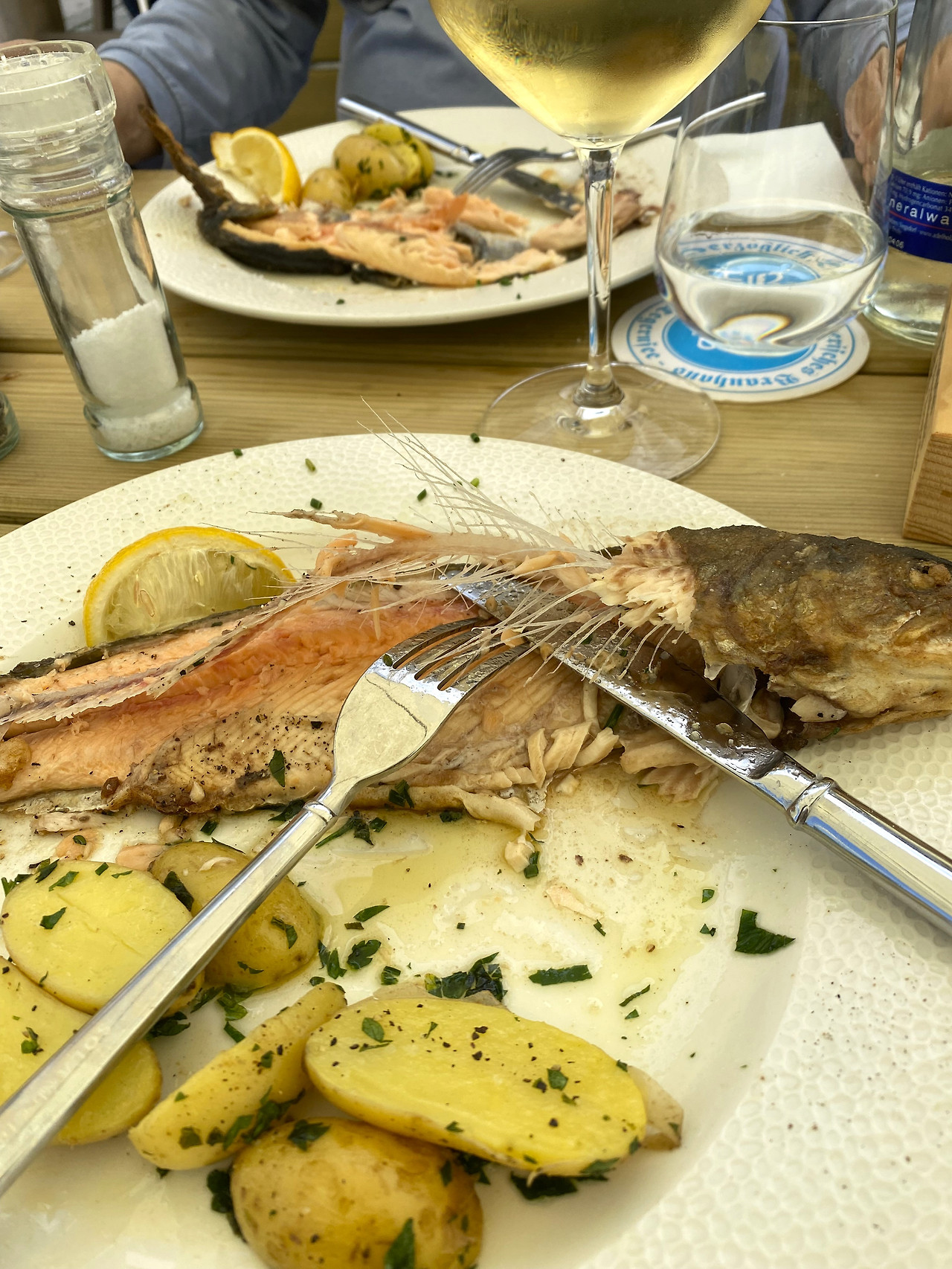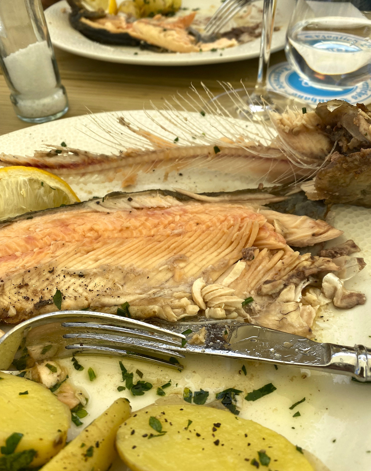 내가 누군가? 생선 가시를 발라 여섯 명 손주들 입에 쏘옥쏘옥 넣어주는 할머니 아닌가. 몇년을 그렇게 지냈더니 생선 가시 바르는데는 도가 텄다. 윗부분을 얌전히 떼어먹고, 뼈가 노출되면 왼손 포크의 도움을 받아 오른손 나이프로 사알사알 뼈를 들어낸다. 절대로 가시를 칼로 자르면 안된다. 가시는 그대로 생선 등뼈에 붙어있어야 바르기 편하고 먹기 편하다.