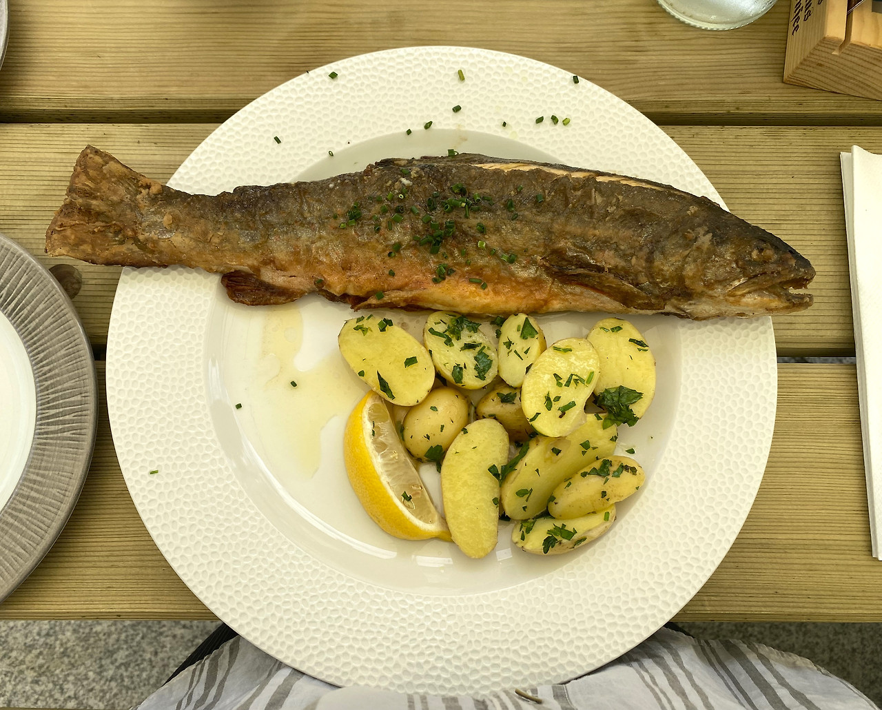 나의 생선 가시 바르는 솜씨. 생선구이, 찐 감자에 허브 뿌림.