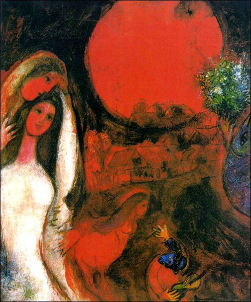그런데 어쩜 이 여인은 죽은 벨라인지도 모르죠. 하얀 드레스의 신부에게서 혼이 분리됨을 상징으로 했는지도 모릅니다. 어쨌든 샤갈은 이 그림을 그린 2년 후 바바 브로드스키와 재혼을 합니다.