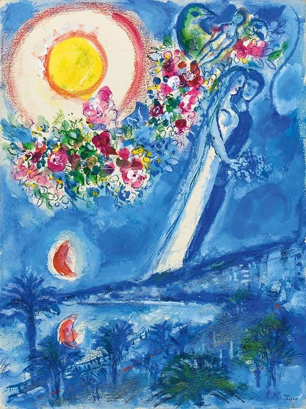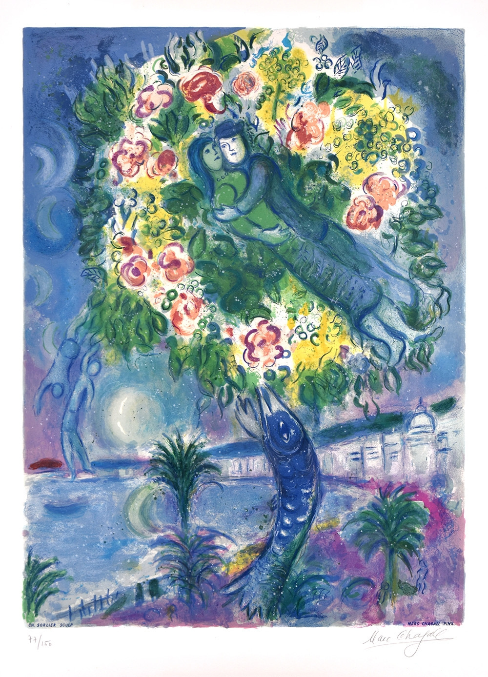 부부는 가장 사적이고 열정적인 존재가 아닐까요? 밝은 달이 아래 도시를 비추는 프랑스 해안입니다. 샤갈과 샤를 솔리에(Charles Sorlier)가 공동으로 제작한 니스와 코트다쥐르(Nice and the Côte d'Azur) 라는 제목의 석판화 12점 세트에 속한 그림으로 이 그림의 배경이 프랑스 해안이라는 것을 알 수 있지요.