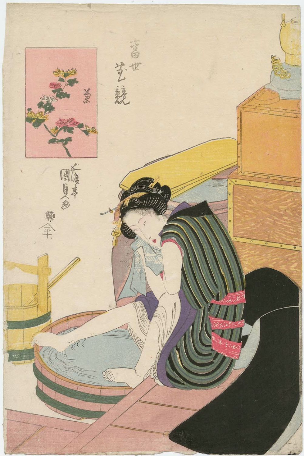 오른쪽 쿠니사다의 그림은 일반 가정용품으로 둘러싸인 목욕하는 여성을 보여준다. 오른쪽 상단 모서리에 있는 물을 데우는 도구와 목욕용 수세미를 보자. 드가의 작품만큼 시야각이 높지는 않지만 여성을 위에서 내려다보는 구도이다. 드가는 목욕용품을 놓은 선반으로 공간을 직선 분할했고, 쿠니사다는 내부 공간을 층을 이루며 대각선으로 분할했다. 여자를 둘러싼 공간과 사물을 활용하여 인물의 시각적 프레임을 구축한다. 색상의 반복과 단순화된 모양은 명암대비의 부족과 마찬가지로 강력한 표면 패턴을 만든다.