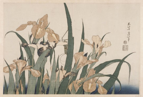 왼쪽; 가츠시카 호쿠사이 Katsushika Hokusai <붓꽃과 메뚜기> 1833. 채색퍈화. 파리 기메박물관.