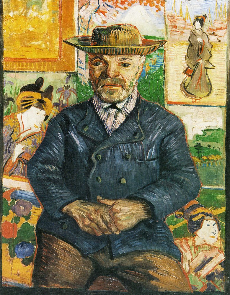 고흐는 앤트워프에 살고 있을 때 처음으로 우키요에를 접했다. 탕귀 초상화 배경의 판화는 고흐 형제가 수집한 일본 판화 중 일부다. 일본 문화를 신화화하는 경향이 있었던 반 고흐는 일본의 삶과 예술가를 이상화했다. 세 개의 초상화 시리즈 중 하나인 그림 왼쪽 작품(로뎅미술관 소장)을 탕귀는 죽을 때까지 가지고 있었다.