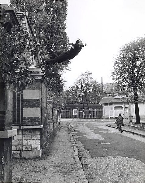 이 유명한 사진 속에서 클랭은 거리의 2층 높이에서 공중으로 뛰어내린다. 그는 떨어지지 않는 것처럼 보인다. 몸은 허공 속에서 멈춰 있고, 그 아래의 땅은 텅 비어 있다. 이 이미지가 강렬한 이유는 ‘믿음’이 개입되어 있기 때문이다.