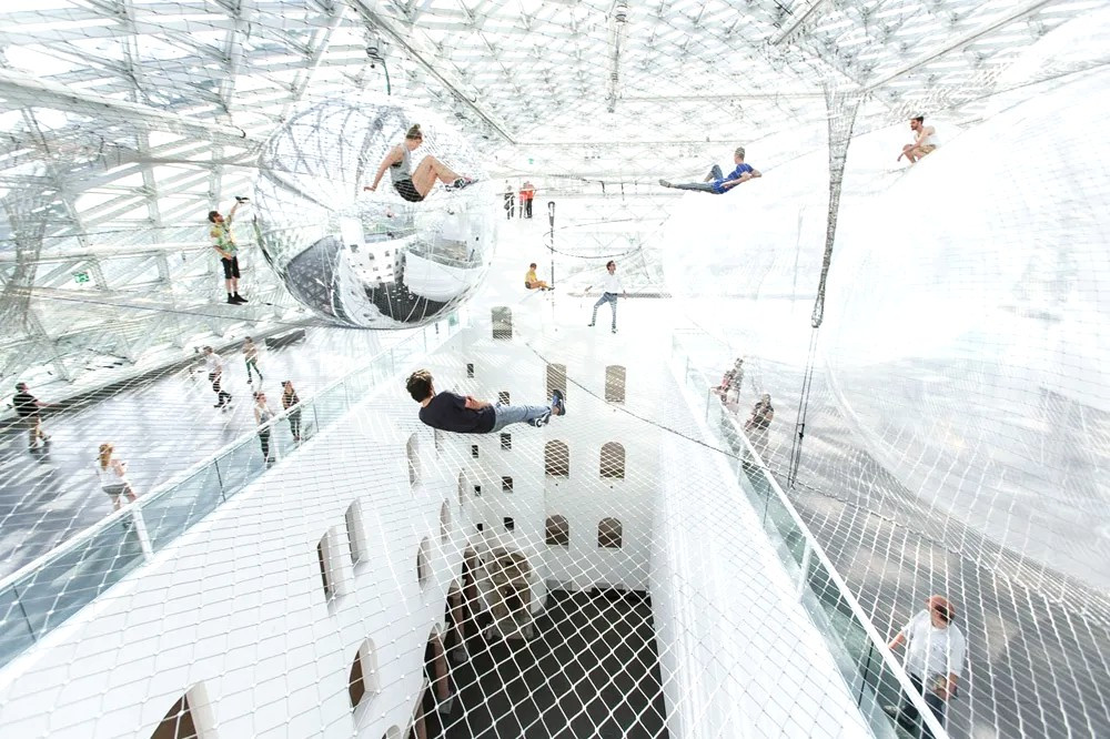 독일 뒤셀도르프 K21 미술관에 설치된 <궤도 안 In Orbit>은 공중에 매달린 거대한 그물 구조 위를 관람객이 직접 걸어 다니는 작품이다. 발 아래에는 수십 미터의 공간이 펼쳐지고, 몸은 흔들리는 구조물 위에서 균형을 잡아야 한다.