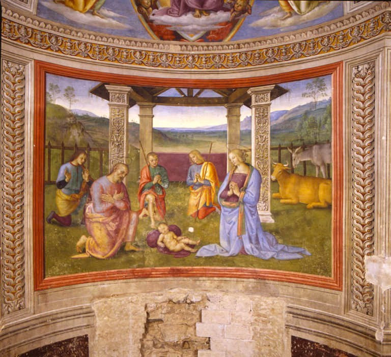 피에트로 페루지노 <예수탄생> 1503, 프레스코화, 630×480cm. 산 프란체스코 성당(정면 오른쪽 벽), 몬테팔코, 이탈리아.