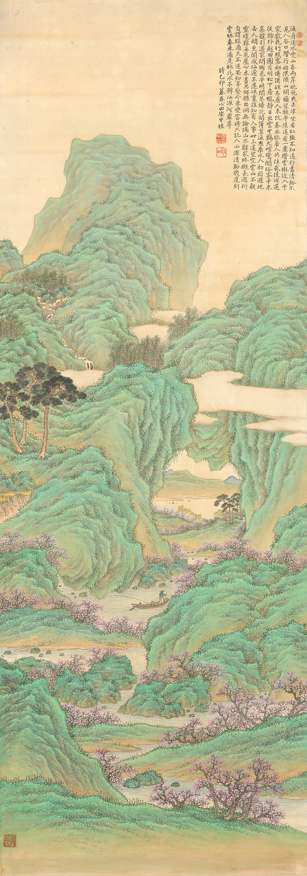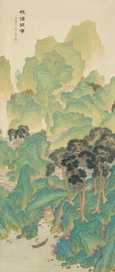 도연명(陶淵明)의 <도화원기>를 주제로 그린 대표적인 청록산수화. 각이 심하게 진 바위산의 윤곽선에는 청색을 사용하고, 안쪽으로 갈수록 밝은 녹색을 더해 골짜기 사이로 빛이 새어나오는 듯한 효과는 동양의 유토피아인 도원을 연상시킨다.