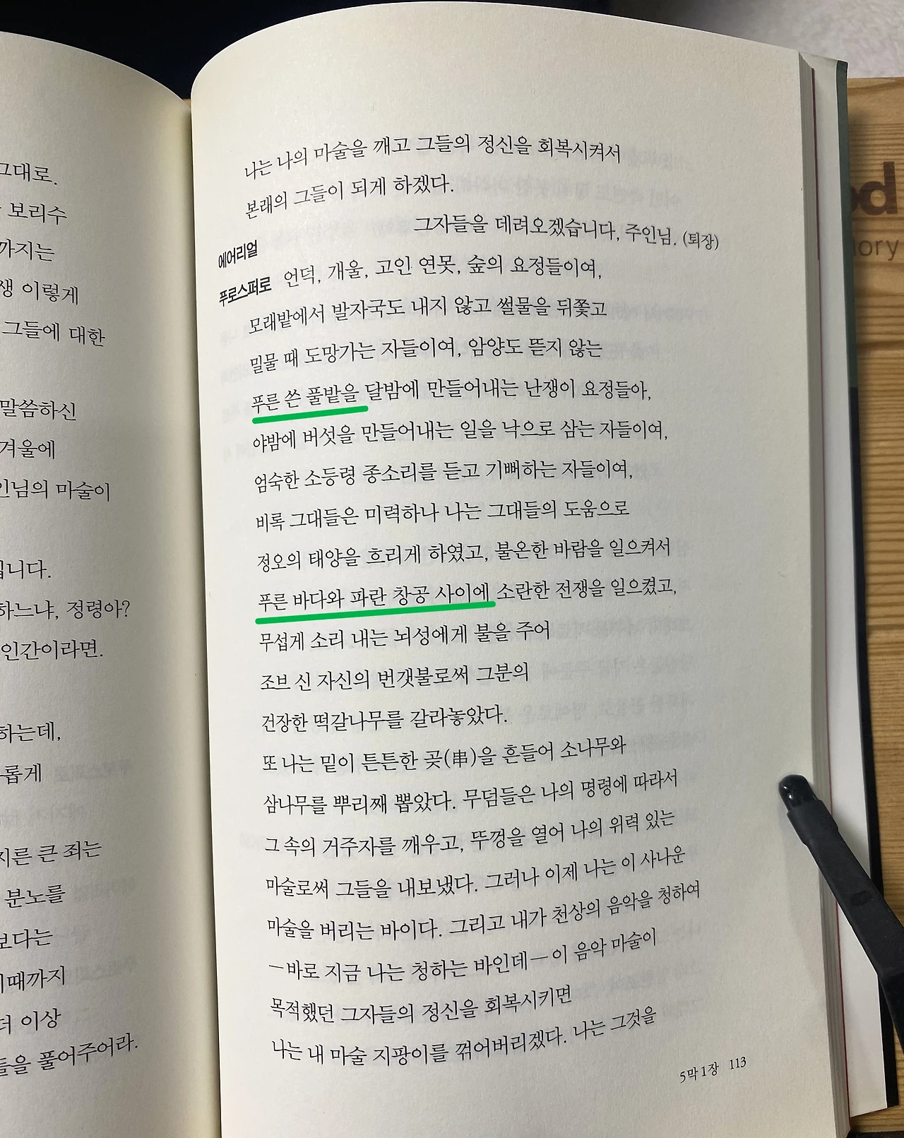 한국에서 '파랑'과 '초록'을 구분해서 쓰기 시작한 것은 근대라고 하지만 정확한 시기는 모른다. 문학작품의 현대 번역에서도 초록과 파랑은 혼용되고 있다. 책에서 한 문장을 찾아보았다.