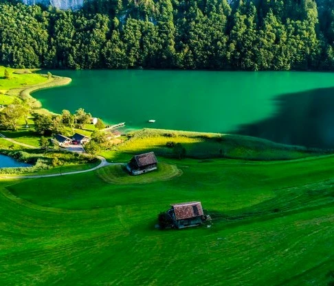 스위스와 오스트리아의 호수에는 여기에 또 하나의 층이 더해진다. 물속에 녹아 있는 석회 성분이 빛의 흐름을 조금 더 굴절시키고, 색을 한층 또렷하게 밀어 올린다. 물은 투명하면서도 묘하게 밀도 있는 초록을 띤다.