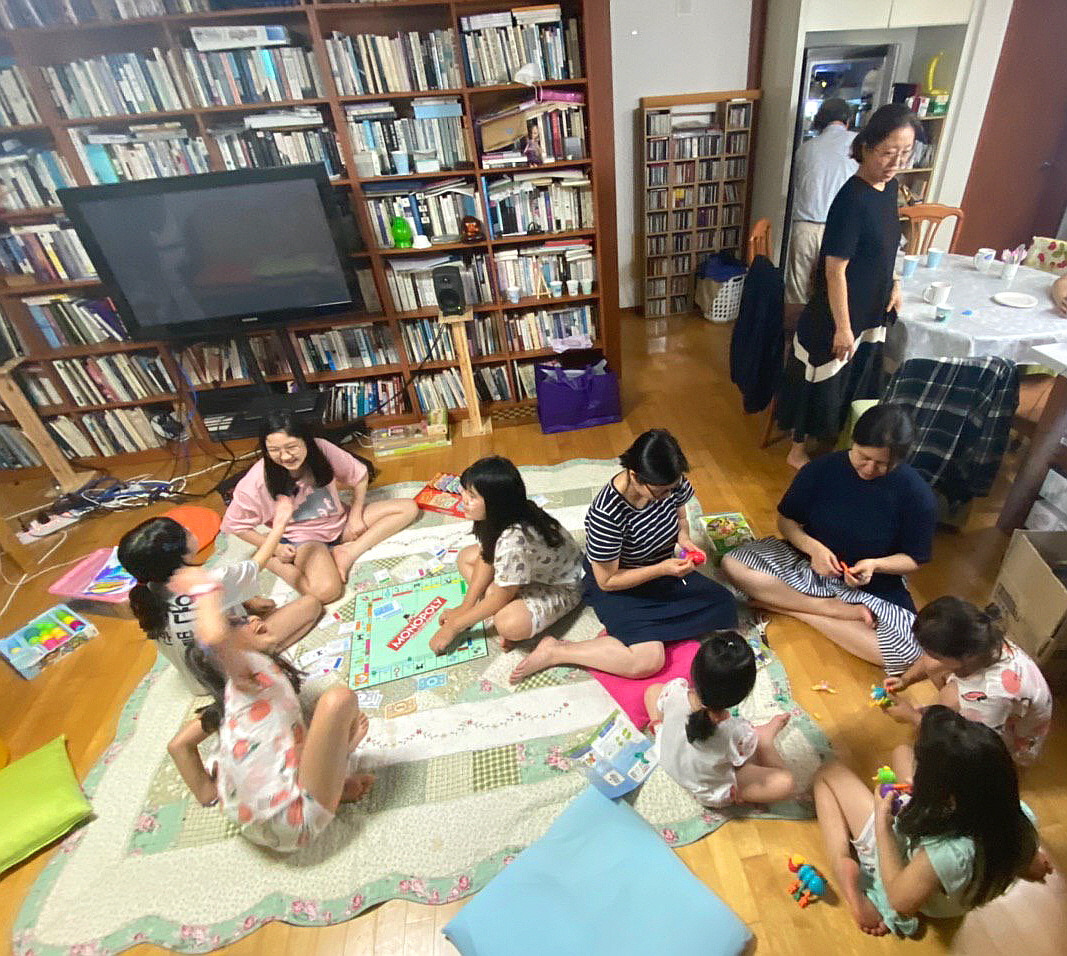 왼쪽은 큰아들집, 손주 6 + 조카손주 2. 오른쪽 은 우리집, 큰 아이들은 모노폴리를, 작은 아이들과 만들기를 하는 두 며느리.