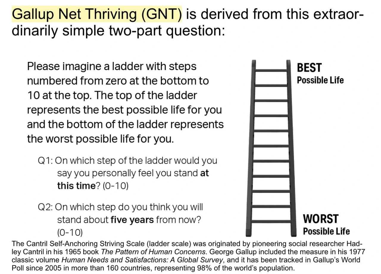 5. 위 세 가지 상태에 대한 언급 이후 책에서 중요하게 제안하는 개념이 바로 Net Thriving입니다. 제 영어가 수려하지 않아서이기도 하겠으나 참으로 번역하기 어려운 단어입니다. 참고로 thriving은 번영, 흥성, 호황 등의 뜻을 가지고 있습니다. 즉 얼마나 나의 삶이 번영하고 있냐 이걸 측정하는 지수라고 볼 수 있겠죠. 갤럽이 여기서 이걸 측정하기 위해 재미있는 사다리와 함께 또 다른 중요한 질문을 던집니다.