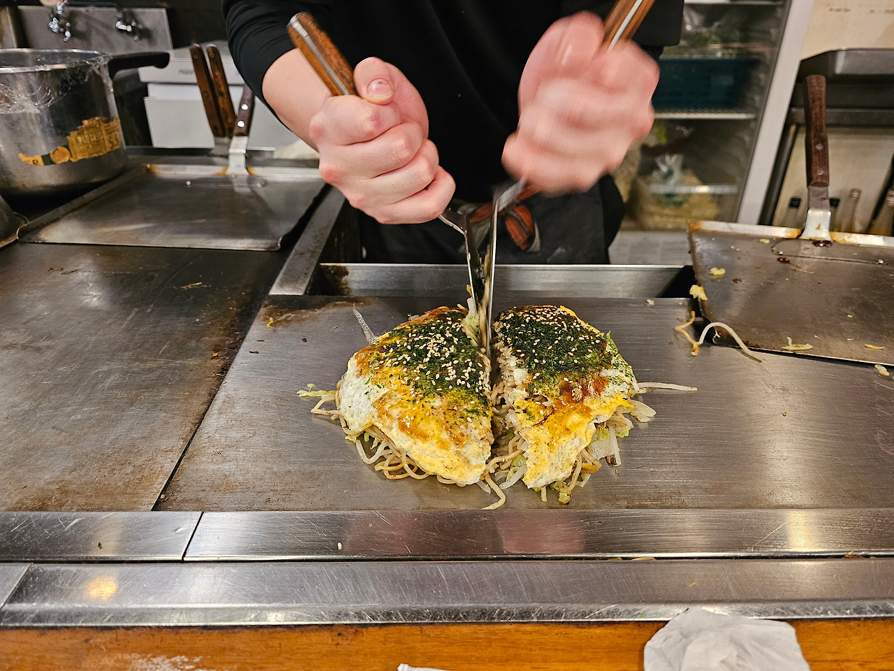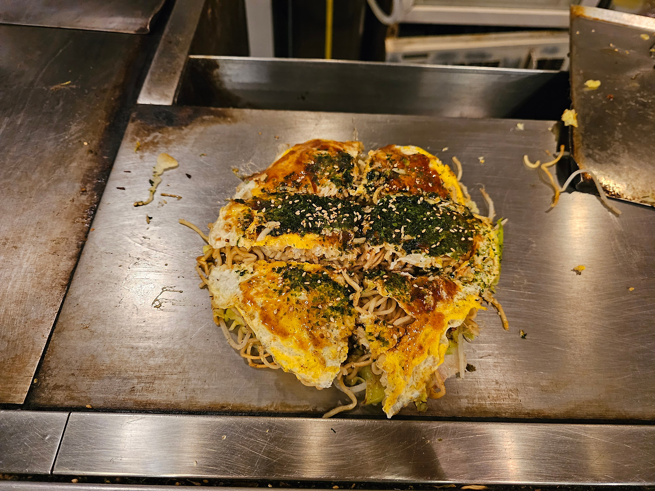 함께 연수를 온 담당자가 오꼬노미야끼를 먹어 보고 싶다고 하였다. 마침 야구도 좋아하시니까 히로시마 식 오꼬노미야끼를 추천하여 함께 주방 철판 뷰를 배경으로 먹어보았다.
