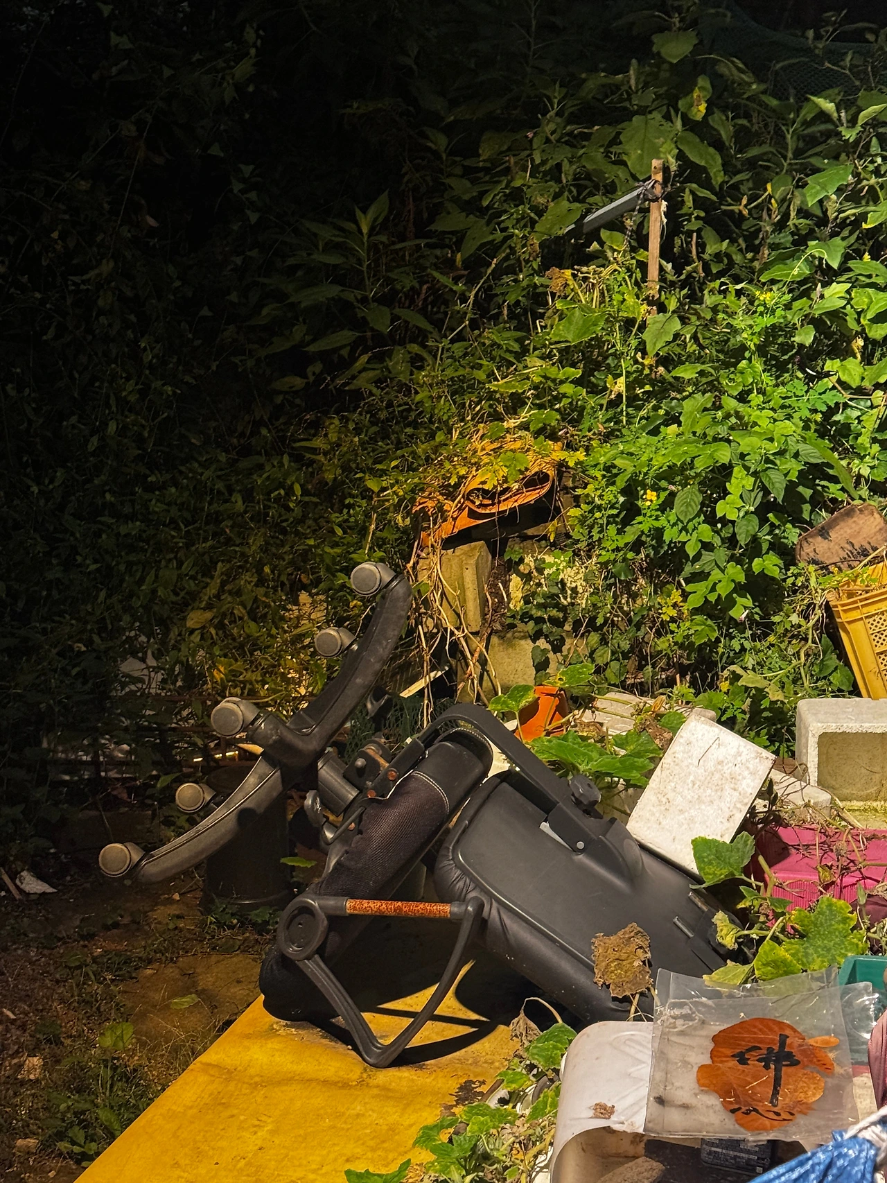 누군가의 시간을 버티던 금속과 가죽은 이제 흙과 잎 사이에 눕는다.