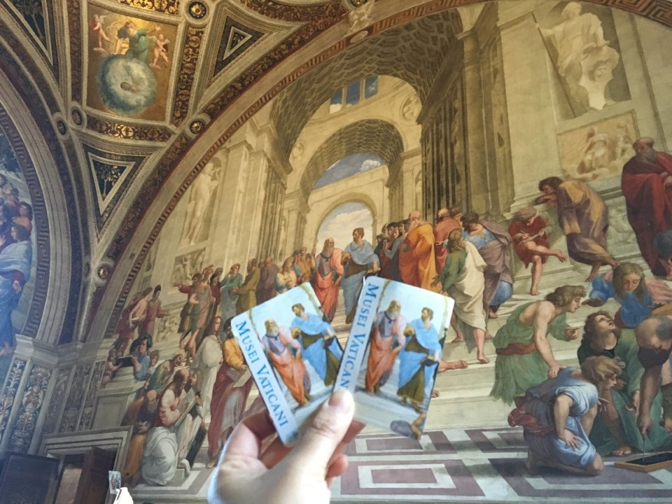 바티칸에서 가장 인상적이었던 순간은 라파엘로의 아네네 학당을 엄마와 함께 보았던 것입니다. 바티칸의 티켓에는 아테네 학당이 그려져 있는데요, 역시 우리나라 사람들의 인증샷은 저 소크라테스와 플라톤에 꼭 맞추어 티켓을 대고 사진을 찍는 것이죠! 외국인들은 그런 한국인들이 신기해서 한국인을 찍어간다는 바로 그 인증샷! 저랑 엄마도 사이즈 잘 맞춰서 각자 바티칸 인증샷을 찍고 둘이 같이 왔다는 의미로 실제 그림을 사이에 두고 티켓 인증샷을 찍었습니다. 혼자가 아니라 정말 둘이 왔음을 실감나게 해주는 그런 순간이었어요. '엄마가 이렇게 좋아하시는데, 더 빨리 여행을 같이 많이 다닐걸' 하는 생각이 들었습니다. 역시 가장 귀중한 것은 시간인 것 같습니다.