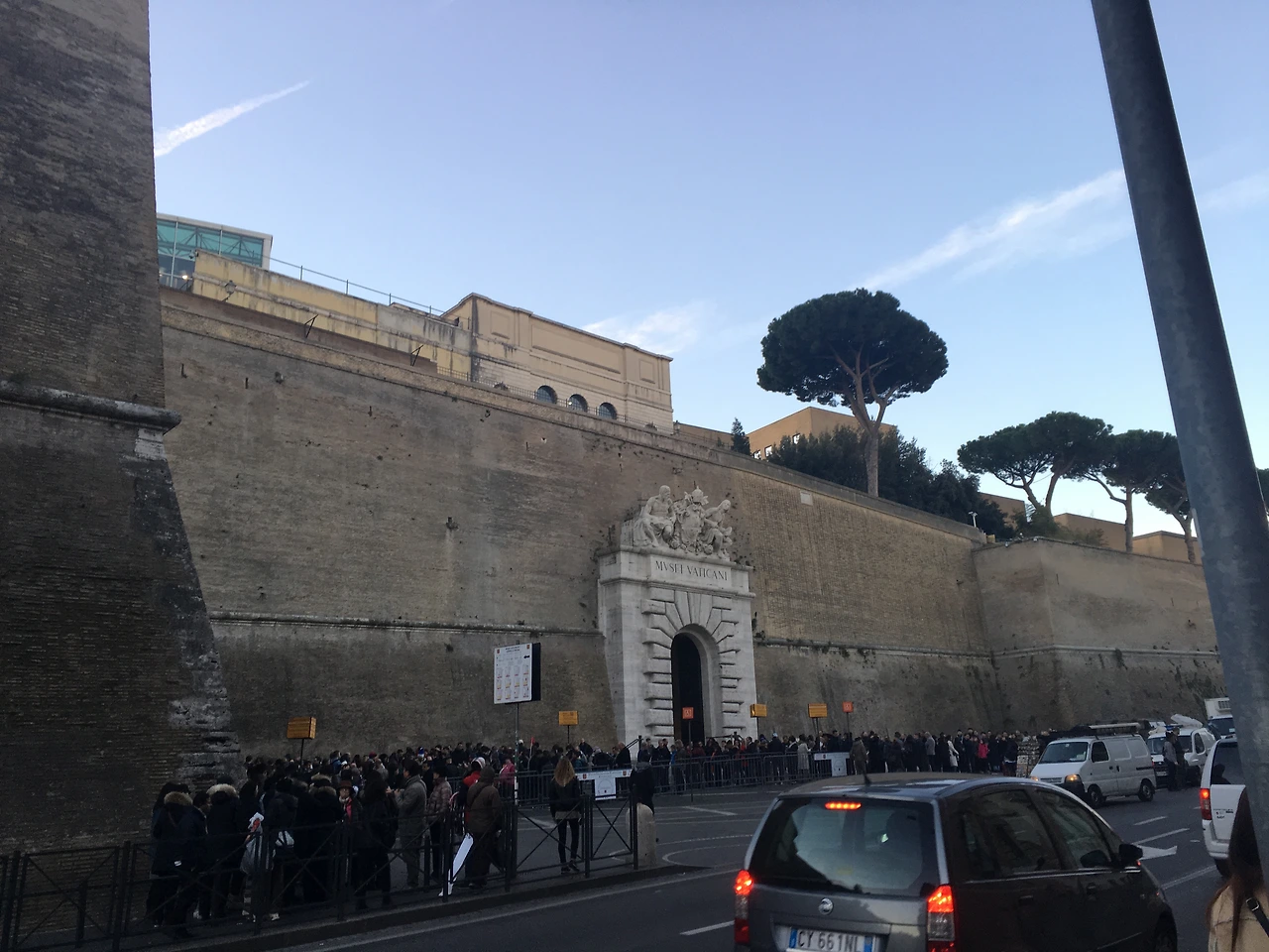 사진에서 보이는 저 바티칸의 돌담 아래에는 흰색 선으로 국경이 표시되어 있는데요, 거길 밟고 남모를 뜻깊음에 심취하다 가이드 선생님이 들려주시는 다양한 로마와 관련된 정보를 들으며 시간을 보냈습니다. 들어가면 아마 사람들에 치여 제대로 설명하지 못할 것 같다며 '천지창조'로 유명한 시스티나 성당 천장화를 설명해주셨습니다. 그렇게 흥미있는 이야기를 들으며 기다리기를 한참, 드디어 바티칸에 입국했습니다.