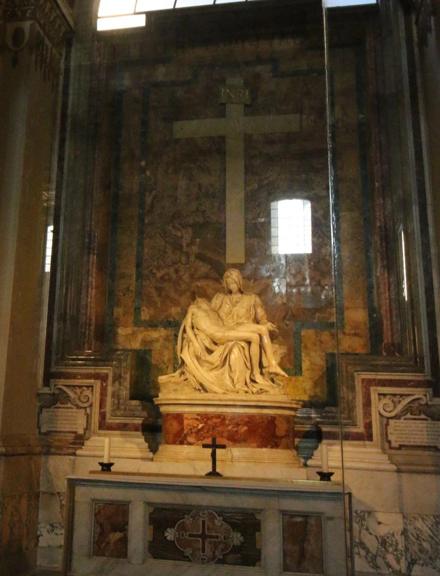 아주 매끈하고 아름다운 대리석으로 이루어진 피에타는 관람자의 입장에서 정면에서 보는 것과 함께, 신이 하늘에서 죽어버린 자신의 아들을 내려다보는 것도 계산된 거의 완벽한 조각상입니다. 마리아의 비율이 숨을 거둔 예수를 안기 위해 좀 크게 조각되었다고 하지만, 실제로 보아도 크다는 느낌은 들지 않더라구요. 하지만 이러한 내용들을 몰라도 이 미켈란젤로의 피에타를 마주하게 되면 눈물이 없이도 느껴지는 슬픔의 크기가 얼마나 거대한지 깨달을 수 있게 됩니다.