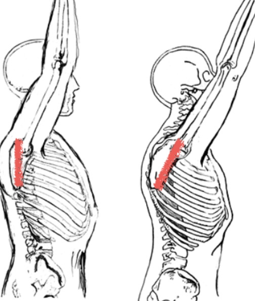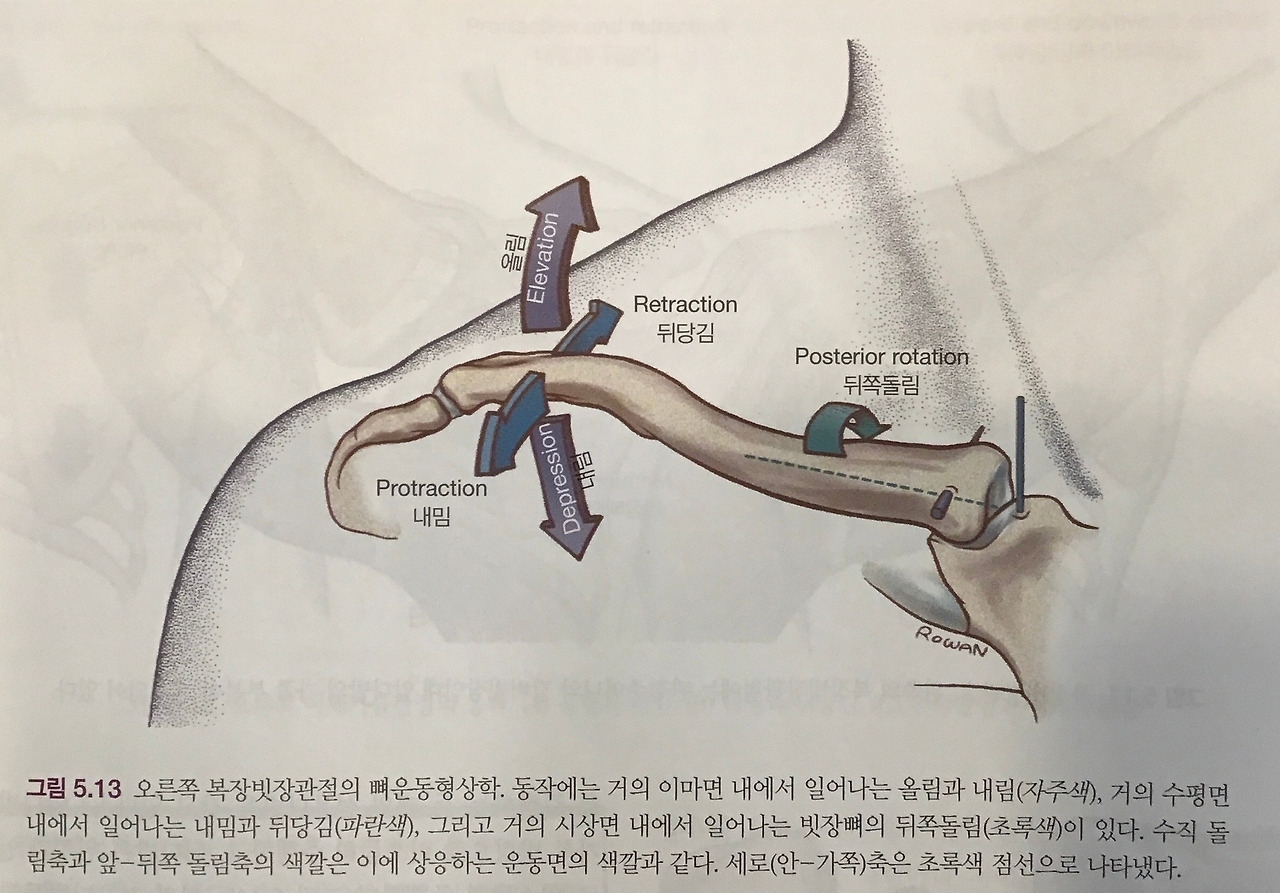 견쇄관절과 흉쇄관절의 동작이 합쳐지는 상방회전(upward rotation)을 동작하면 위 사진과 같은 동작을 할 수 있다. 그런데 개인적으로 그림에서 표현되는 동작에서 아쉬움이 있다. 그림에서 올림동작을 크게 해 쇄골을 더 위로 그려줬다면 팔도 더 위로 들 수 있었을 텐데 말이다. 다르게 생각하면 올림동작을 크게 하지 못했을 때 우리 어깨는 저렇게 밖에 동작할 수 없다고도 말할 수 있겠다.