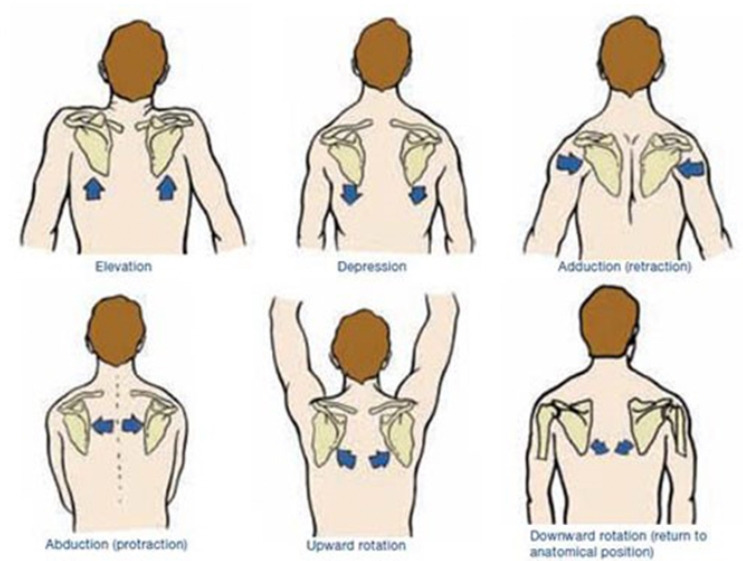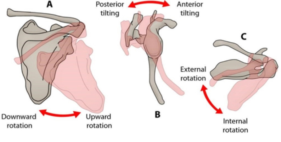 견쇄관절은 미끄럼관절(gliding joint) 또는 평면관절이다. 그렇게 불린 이유는 관절면의 외형이 주로 편평해서다. 주로 편평하다는 것은 약간의 오목과 볼록의 형태도 존재한다는 뜻이다. 관절의 형태를 이야기 한 이유는 아래의 그림처럼 이 관절로 인해 견갑골이 다양하게 움직일 수 있다는 것을 설명하기 위해서이다. 아래의 그림 중에 상방회전 할 때에 강조하고 싶은 동작은 B이다. B는 오른쪽 견갑골을 오른쪽에서 바라봤을 때의 모습이다. posterior tilting은 후방경사라고 부른다. 이 후방경사의 움직임이 나와야 팔을 원활하게 들 수 있다. 만약 그러지 못했을 경우 180도의 견관절의 굴곡이 나오지 않는다. 굴곡이라는 동작은 팔을 앞으로 들어서 만세 하는 것이라고 생각하면 된다.