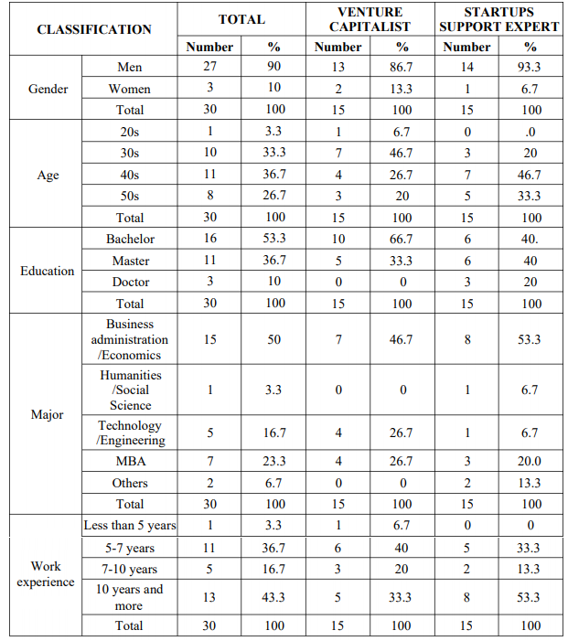 학력은 학사 16명(53.3%), 석사학위 취득 11명(36.7%), 박사학위 취득 3명(10%)이 참여하였다. 스타트업 투자 및 지원 활동 관련 경력은 10년 이상이 13명(43.3%)으로 가장 높았고, 5년 이상~7년 미만 11명(36.7%), 7년 이상~10년 미만 5명(16.7%), 5년 미만이 1명(3.3%) 순이었다.