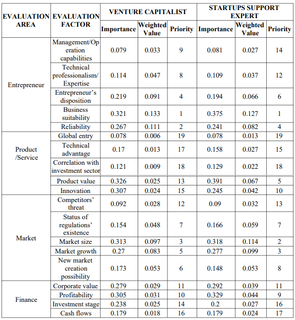 벤처캐피탈의 스타트업 투자 의사결정 영향 요인에 대해 분석한 결과 전체의 경우 1순위 창업가, 2순위 시장, 3순위 제품 및 서비스, 4순위 재무 요인을 중요 요소로 꼽았다.