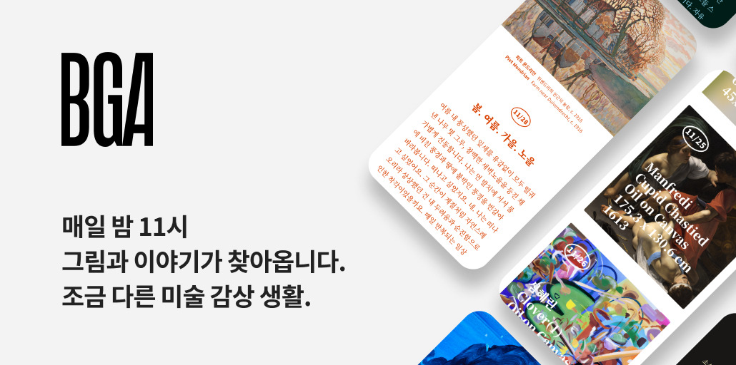 매일 저녁 11시, 하루 한 점의 미술 작품과 에세이를 디지털로 만나볼 수 있는 미술 구독 서비스 플랫폼 '백그라운드 아트웍스(BGA)'. 월 1만 2천 원의 구독료를 지불하면 고전과 현대미술을 넘나드는 다양한 작품들을 웹사이트와, 안드로이드 및 iOS 앱을 통해 감상할 수 있는 서비스를 제공한다.