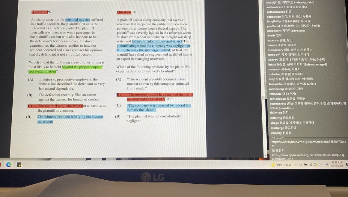 수업을 듣다 보면 느끼겠지만 교수마다 개성이 확실하다. 그 개성을 고려해 접근하면 좋다. 불법행위법 교수는 판례를 아주 디테일하게 읽는 것을 추구했다. “왜?”를 계속 생각하게 만들고 페이지 구석구석 숨은 Key sentence 답변을 요구한다. 그런 수업은 준비할 것도 많고 정신을 제대로 차려야 한다.