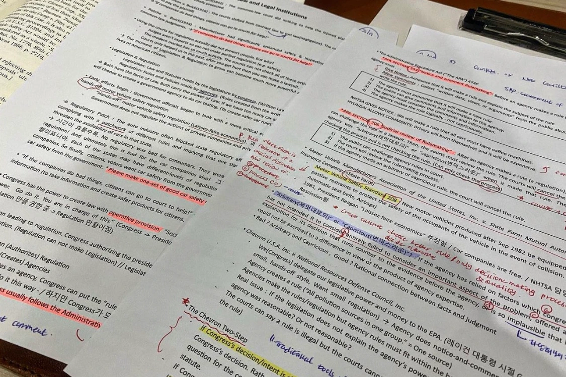 그렇게 꾸역꾸역 하다 보면 무언가 보였고 매번 데드라인에 맞춰 제출은 했다. 판례를 읽을 때 어떤 식으로 접근하고 분석하는지, 최종 판결까지 얼마나 세심한 작업과 사고를 요구하는지 알게 되었다. 나처럼 비전공자이거나 실무 경험이 없는 분들의 경우 이 수업을 정말 어려워했는데 이 과정을 거치면 판례를 보는 시야가 확연히 달라진다. 개인적으로 로스쿨 수업 중 이 수업이 가장 유익하지 않았나 싶다.