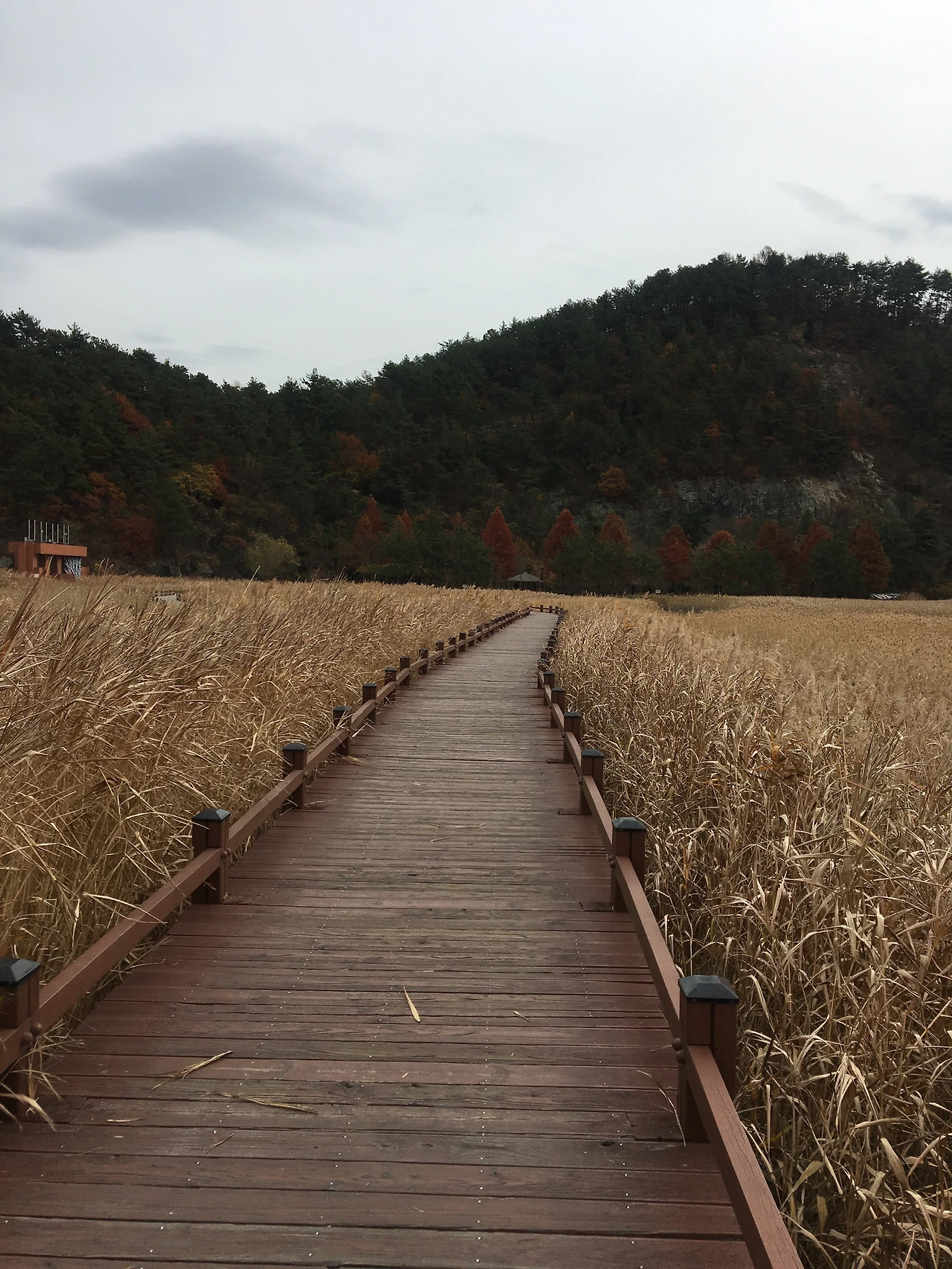 택시에서 내려 주위를 둘러보니 비수기라 그런지 사람이 거의 없었다. 매표소로 가 입장권을 구매하고 입구로 들어섰다. 얼마간 도보로 이동한 후 드디어 순천만 갈대밭의 장관이 펼쳐지는 시작점에 다다랐다. 자연스럽게 나오는 감탄사와 함께 여기저기 눈에 들어오는 놓치기 아까운 풍경을 휴대폰 카메라에 담으며 일부러 천천히 발검음을 옮겼다. 드문드문 무리 지어 있는 철새들이 보였고 사이좋게 하늘을 나는 솔개들도 보였다. 드디어 용산 전망대 초입에 도착해 낮은 야산을 느린 걸음으로 올라가기 시작했다.