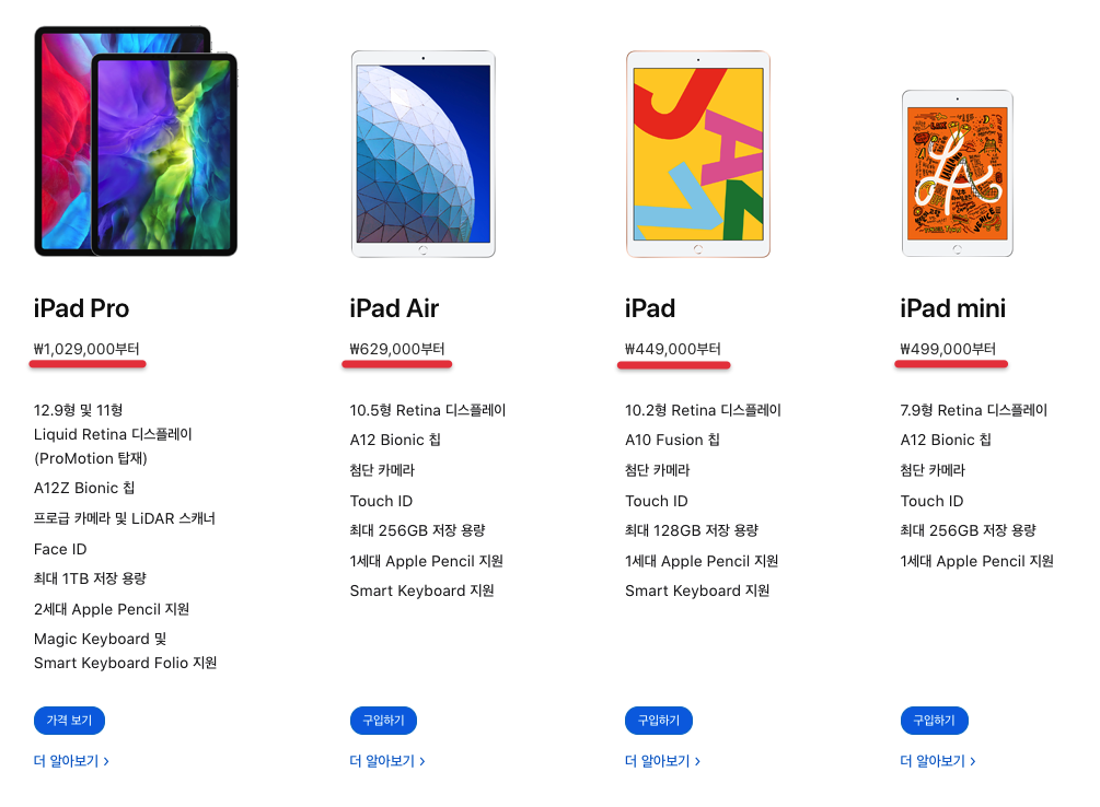 가격은 각각 103만 원대부터 50만 원대까지 다양하게 구비되어 있는데, 왜 애매하다고 했을까? 본질적으로 컴퓨터로써 제 구실을 그나마 할 수 있는 제품이 "아이패드 프로" 밖에 없기 때문이다.