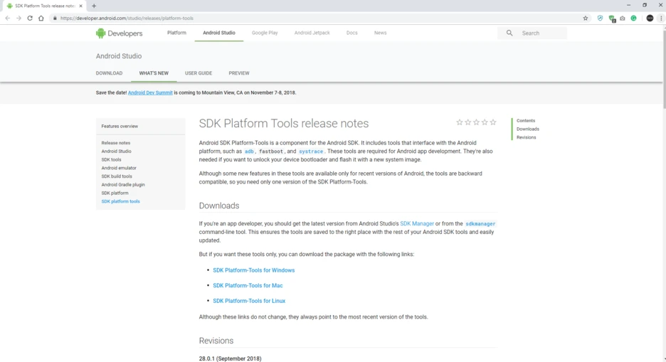 1. 위와 같은 Android Developers 사이트로 이동하여, 본인의 OS에 맞는 SDK Platform-Tools를 설치해주세요. 필자의 경우 Windows 10을 사용 중에 있으니 SDK Platform-Tools for Windows를 다운로드했습니다.