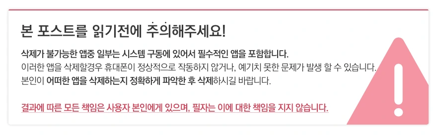 만약 잘못된 시스템 앱을 삭제했다면, 공장초기화를 돌리기 전까지 시스템이 불안정해질 수 있습니다.
