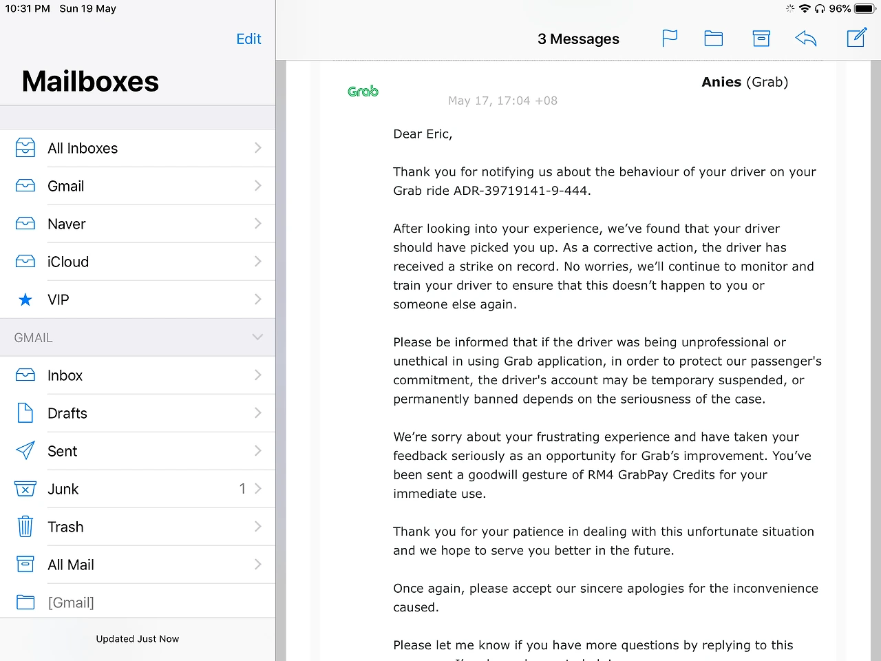 상황 설명을 하자면, 그랩 기사가 필자를 요청한 위치까지 도달하지 못했으며, 중간에 위치를 찾지 못하여 캔슬을 한 상황이다. 어찌 보면 크게 받아들일만한 일이 아녔겠지만, 그랩 측에선 사과의 의미로 4링깃 및 드라이버에 적절한 조치를 취했다고 연락이 왔다. 이러한 적절하면서도, 드라이버에게 강력한 조치를 취함으로써 드라이버가 사용자에게 부적절한 언행을 보이지 않는다. 당연하게도 이러한 부적절한 조치로 인하여 계정이 영구 정지된다면, 영구적으로 플랫폼에서 퇴출된다.