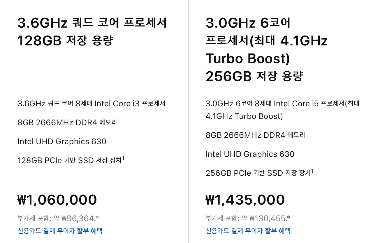 만약 여웃돈이 남아있고, 보다 쾌적한 macOS를 사용하고 싶다면 차라리 '메모리' 업그레이드를 선택하는 게 옳은 선택이다. 다만 애플은 메모리를 어디 다른 세계에서 사 오는 건지 몰라도, 8기가에서 16기가로 업그레이드하는 옵션이 24만 원이라는 입이 벌어지는 가격 책정을 보여준다. 애플의 경우 메모리, CPU 그리고 당연히 그 어떠한 부품이라도 임의 변경이 불가능하다. 처음에 구매한 모델이, 최종적인 스펙이 된다는 의미니까 신중하게 고민하는 것이 좋다.