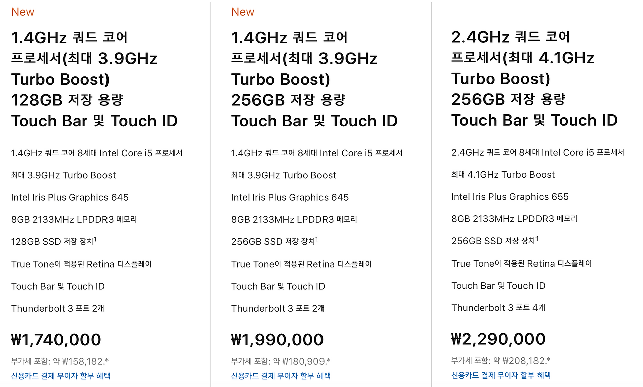 아까 말한 '맥북 에어'가 256기가에 174만 원이었다면, '맥북 프로' 128기가 모델이 같은 가격으로 책정되었다. 더 좋은 그래픽과, 1.6 Ghz 듀얼코어에서 1.4 Ghz 쿼드코어를 사용할 수 있다. 여기서 듀얼코어는 1.6 Ghz짜리 코어가 2개 있다는 의미이며, 쿼드코어는 1.4 Ghz짜리 코어가 4개 있다는 의미이다. 간단한 암산으로 어떤 게 더 좋은 건지는 금방 계산할 수 있으리라 믿는다. 거기에 터치 바까지 포함되어 있으니, '맥북 에어'가 왜 D.O.A라고 평가받는지 이제 이해가 좀 더 쉬워졌을 것이라고 생각된다.