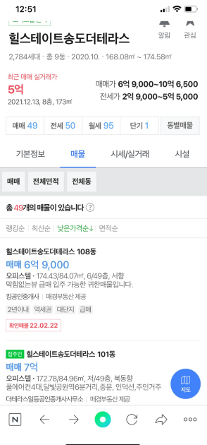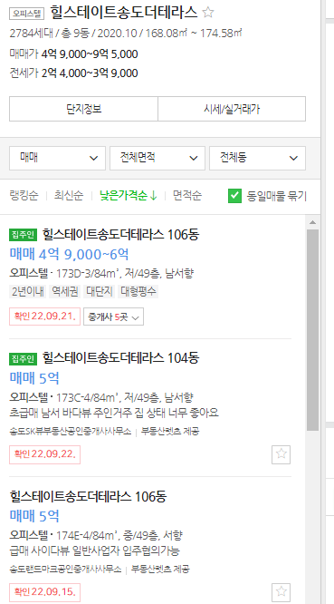 '22년 1월이었던 걸로 기억합니다. 저는 부동산 공부에 심취해 있었고 단기간에 아파트 여러 개를 갭을 끼고 투자했습니다. 명의가 가득 차서 이제는 더 이상 투자할 곳이 없겠다고 생각이 들던 찰나에 제 눈에 들어온 물건은 오피스텔이었습니다. 송도는 조정지역이라 아파트를 추가로 취득하게 되면 취득세 12%의 중과를 맞게 됩니다. 하지만, 오피스텔은 중과가 없습니다. 아파트보다는 규제가 좀 더 자유롭기 때문에 오피스텔은 취득세가 4.6%로 고정되어 있습니다. 그래서 제 눈에 들어온 게 힐스테이트 송도 더 테라스였습니다. 그때 당시 제가 캡처해둔 네이버 호가가 있습니다. 한 번 볼게요.