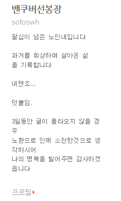 그런데 오늘 퇴근길, 글 하나가 올라왔습니다. '서울 그래서 서울'이라는 글인데요. 여기에서 81세 노인이 절대 경험할 수 없는 글들을 서술해놨더군요. 제가 바보였습니다. 맞습니다. 벤쿠버 선봉장님은 81세 노인이 아니었습니다. 단순히 이 캐릭터는 벤쿠버선봉장님이 만든 부캐였고 블로그에 업로드하는 글들은 본인이 겪은 경험에 MSG를 뿌려 만든 소설이라는 어렴풋이 알게 됐습니다. 물론 벤쿠버선봉장님이 모두 겪은 경험일 수 있습니다. 하지만, 이제는 이 모든 게 사실이다라는 생각은 내려놓기로 했습니다. 여자친구의 말이 맞았습니다. 제가 가장 신뢰하는 사람의 말을 '에이 그래도.. 설마 거짓말을 하겠어?'라는 착한 마음으로 믿지 않았다는 게 부끄럽습니다. 여자친구에게 가장 미안한 오늘입니다.