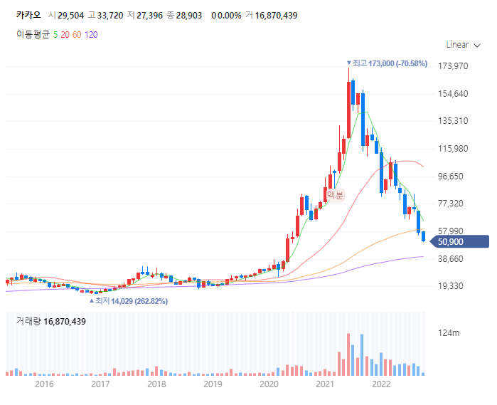 어떻게 이 글을 시작해야 될지 모르겠다. 내가 널 만난 건 아마도 2013년이었던 것 같아. 너는 다음을 통해 우회상장을 했었지. 그때 엄청난 화제를 끌었어. 하지만 관심을 끈지도 잠시 2017년 11월을 기점으로 넌 나락으로 가기 시작했어. 하지만, 나는 널 버리지 않았어. 왜냐하면 사람들의 핸드폰에서는 계속해서 너를 찾는 소리가 들렸으니까 말이야. 사람들은 너에게서 벗어나지 못했어. 모든 삶이 너로 연결되는 걸 나는 보고 있었지. 물론 스티브 잡스가 만든 스마트폰이라는 혁명적인 기술에 숟가락을 얹는 것으로 시작한 너지만 너는 카카오톡이라는 플랫폼을 중심으로 엄청난 성장을 해나갔어. 어느 날 카카오 택시를 만들고, 어느 날 카카오 뱅크를 만들고 또 카카오헤어와 같은 서비스도 만들면서 그야말로 엄청난 성장을 해 나갔지. 내가 파악하기로는 너의 자식들이 90명이 넘었던 걸로 기억해. 카카오뱅크, 카카오모빌리티, 두나무 등등 셀 수 도 없어.