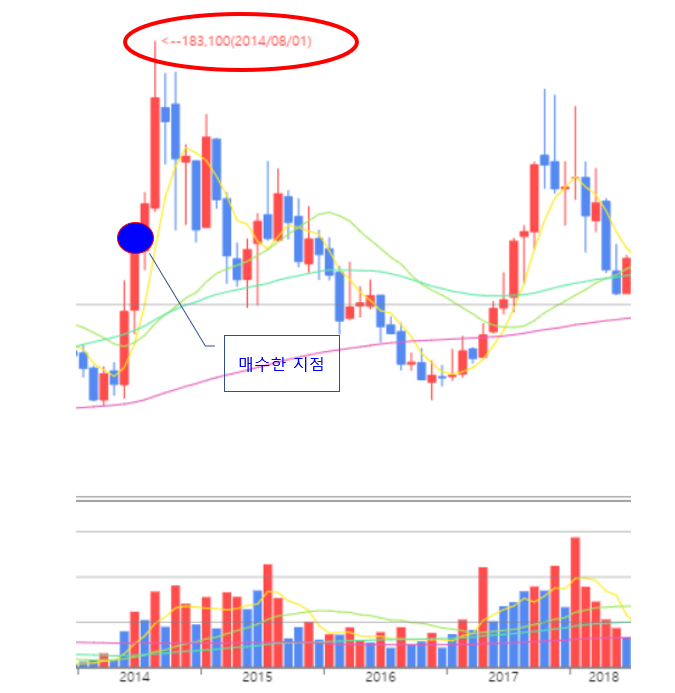 우회상장을 한다는 호재로 인해 다음커뮤니케이션은 2014년 8월 1일 주가는 183,100원으로 최고점을 찍었다. (지금은 액면분할이 됐지만, 액면분할 이전 기준인 점을 참고해달라).