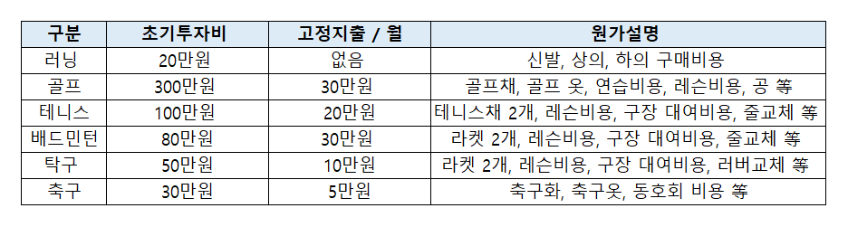 저는 러닝을 좋아해요. 러닝은 투입 원가도 정말 적지만 효율은 엄청나요. 저는 정말 많은 운동을 해 봤는데요. 그중에서도 러닝이 시간 없는 직장인들에게는 최고의 운동이에요 정말. 왜 그런지 한 번 설명을 해볼게요. 우선 지금까지 제가 했던 운동들의 투입원가를 한 번 계산해봤어요. 한 번 같이 보시죠. 제 개인적인 사견이 들어간 숫자이기 때문에 참고만 해주세요. 보시면 초기 투자비와 고정 지출비를 나눠서 검토를 해봤는데요. 다른 운동들은 초기 투자비도 어느 정도 들어간다고 하지만 골프, 테니스, 배드민턴과 같이 레슨이 들어가는 운동들은 고정지출이 많아요. 골프를 제가 월 30만 원이라고 썼지만 내가 얼마나 골프에 진심이냐에 따라서 저 가격은 천차만별이에요. 아마 월 100만 원까지 쓰는 사람들도 허다할 거예요.