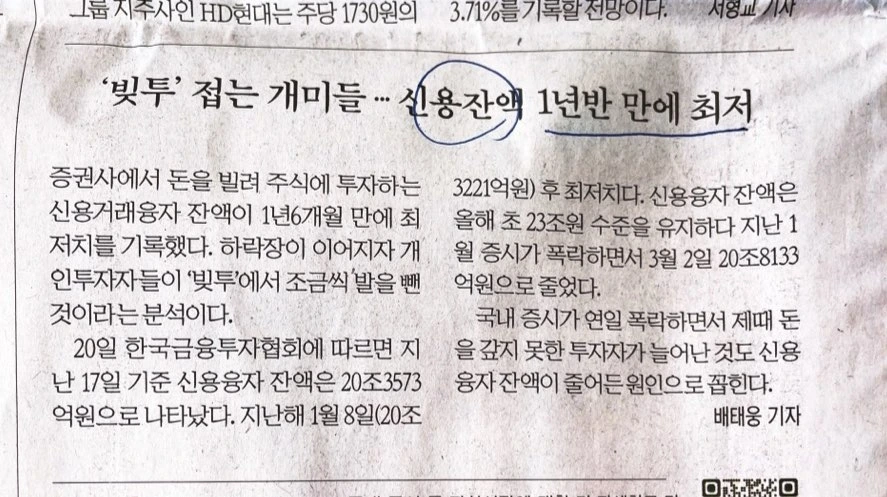 주식시장 유동성장의 파티가 끝났다. 코스피는 처참하게 떨어졌고 3,000을 훌쩍 넘었던 코스피 지수는 현재 2,350에 머물러 있다. 요즘 신문에는 곡소리 나는 기사밖에 없다. 돈을 빌려 주식에 투자하는 신용거래융자 잔액이 최저치다. 그만큼 빛내서 투자를 하지 않는다는 얘기다. 아마도 주변에 둘러보면 주식으로 돈을 벌었다는 사람을 쉽게 찾을 수 없을 것이다. 그렇다. 세상은 내가 돈을 쉽게 벌도록 절대로 가만두지 않는다. 남들도 돈을 벌어 나도 되겠다 뛰어들면 그때 곡소리의 서막은 다가오고 있는 것이다. 영원할 줄만 알았던 상승장은 내가 매도조차 할 수 없는 순간에 끝나버렸다. 사실 우리는 알고 있다. 주변에서 누구나 돈을 벌 때 그때가 상승의 꼭짓점이라는 것을. 수많은 현인이 쓴 책에서 읽었던 내용 아닌가? 하워드막스 책에서 나온 글을 한 번 보자. '다른 사람들이 무작정 확신하고 공격적으로 매수할 때 우리는 매우 신중하게 행동해야 한다. 다른 사람들이 공포심에 아무것도 하지 않거나, 패닉 상태에서 매도할 때 우리는 공격적으로 행동해야 한다.' 한번 이 글을 곱씹어 보자. 소름이 돋는다. 주식을 하지 않던 친구들도 카카오나 삼성전자를 매수하며 공격적으로 매수했다. 그 신호는 주식시장이 정점에 다가왔다는 신호였고, 잠시 시장에서 떠났어야 했다. 하지만 나는 글로 배웠음에도 불구하고 그 신호를 읽지 못했고 대중과 같은 길을 선택했다. 계속해서 공격적으로 투자한 것이다.