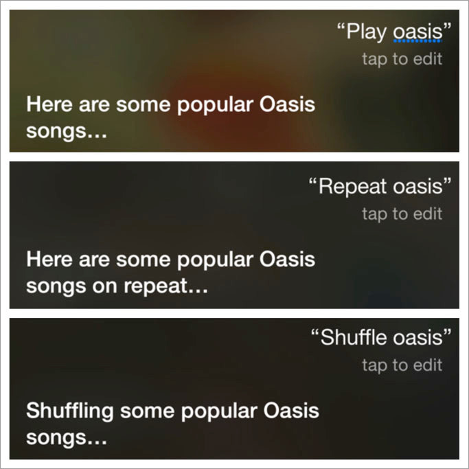 iOS 8.3까지는 'Play 음악/아티스트/장르’라고 말하면 아이폰 내의 음악만을 재생했지만, 애플 뮤직을 활성화한 iOS 8.4부터 이렇게 말을 했다간 스트리밍 서비스가 실행됩니다. 아래의 사진을 보면 'Play, Repeat, Shuffle 음악/아티스트/장르'라고만 말했더니 ‘Here are some popular...’이라는 문구가 뜨며 애플 뮤직이 실행되는 걸 볼 수 있습니다. ▼