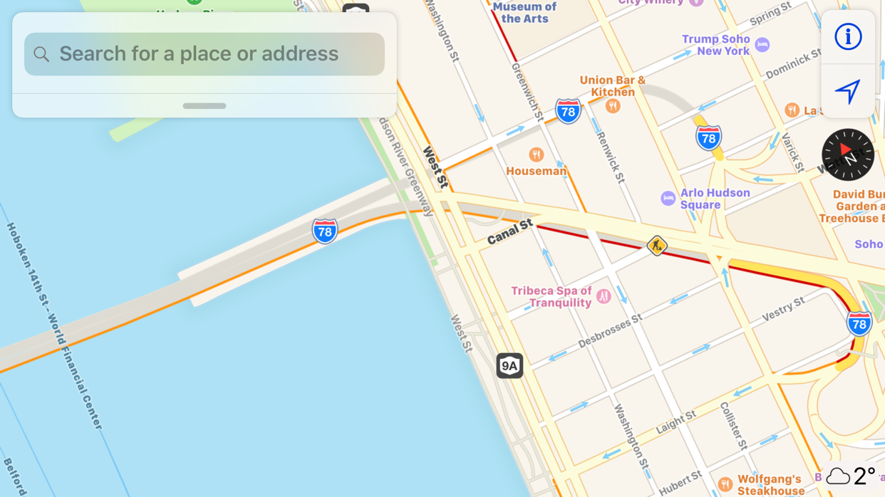 다른 단점으로는, 한국 애플 지도는 교통체증을 보여주지 않습니다. 아래의 뉴욕 지역 애플 지도는 교통 정체 구간을 주황색 선과 빨간색 선으로 알려줍니다. 주황색 선은 교통 정체가 조금씩 심해진다는 표시이고, 빨간색 선은 차들이 거의 움직이지 않는다고 보시면 됩니다.