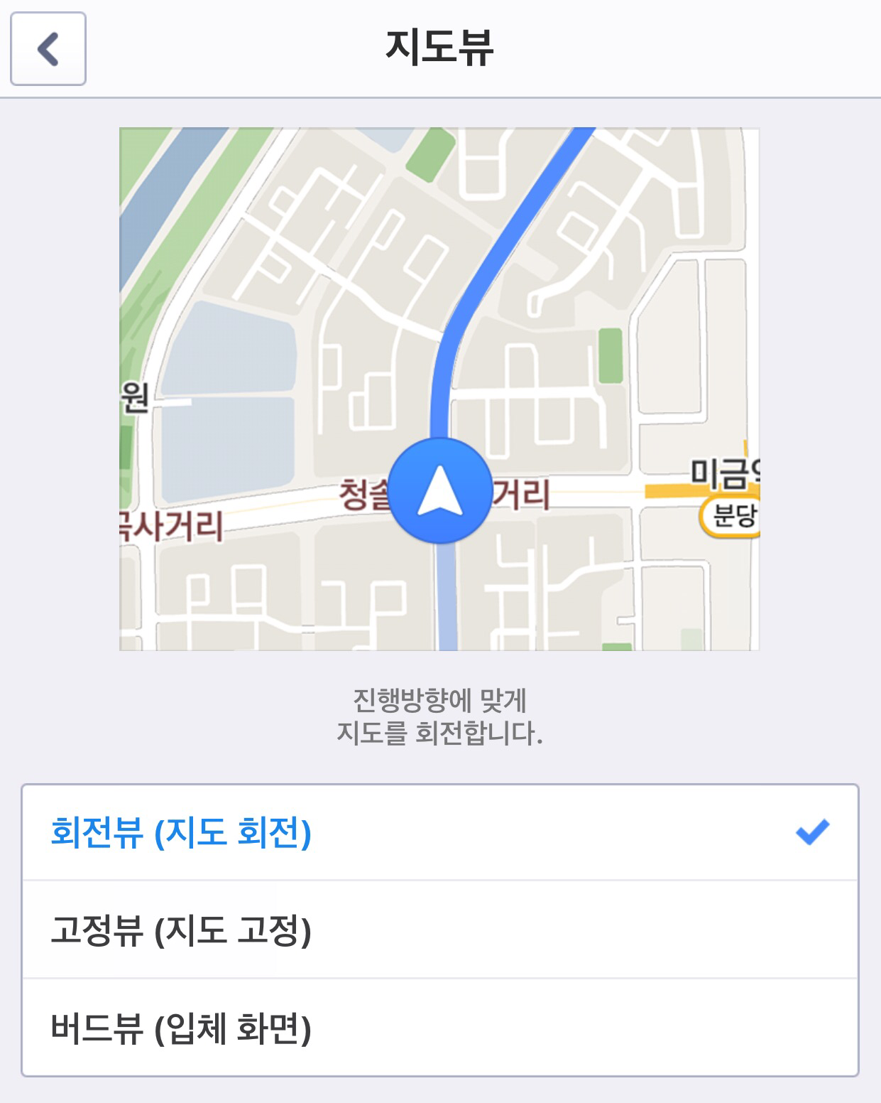 네이버 지도는 애플 지도와 달리 무조건 북쪽을 기준으로 고정되어있습니다. 그래서 '도보'로 이동시 방향 전환에 따라 지도가 자체적으로 회전하지 않습니다. 손가락으로 움직여도 지도가 상하좌우로만 움직일 뿐 회전이 되지 않습니다. 하지만 2016년 4월에 출시된 네이버 내비게이션은 지도 회전을 지원합니다.