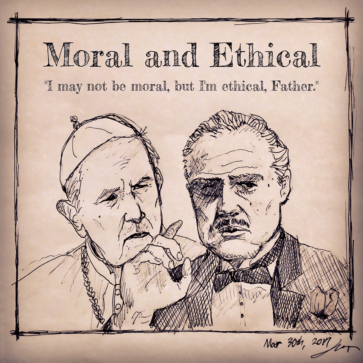 염두에 두세요. 윤리적으로 옳다 하여 꼭 도덕적으로 올바른 것은 아닙니다. 그 반대도 마찬가지입니다. 예를 들어, 오메르타(Omertà)는 마피아 단원들 사이에서 태어난 침묵의 규율입니다. 경찰로부터 범죄자(또는 동지)를 지키기 위해 사용된 규칙입니다. 오메르타를 지키는 것은 조직을 위해 윤리적으로 올바른 행동강령을 따르는 것이나, 도덕적인 관점에서는 틀렸다고 보일 수 있습니다.