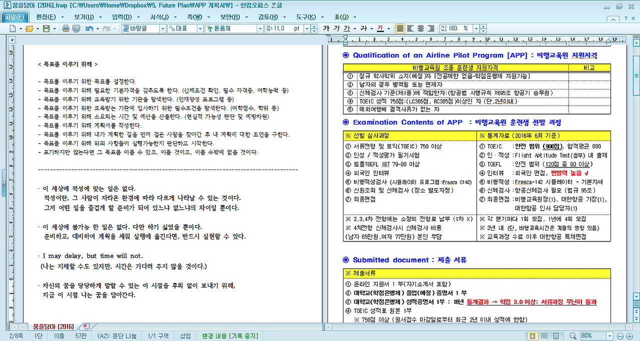 대한항공에서 조종사를 직접 양성하는 3년짜리 프로그램인데 조종사 1명이 배출되기 위해서는 약 1억 7천만 원이 들어간다고 해요. 학사 자격과 영어 성적만 있으면 지원할 수 있고, 매 분기 대한항공 비행훈련원에서 선발하는 과정입니다. APP를 알게 된 후, APP에 대해 상세하게 조사하고 분석하여 계획서를 만들었었습니다. 이 계획이 가장 빠르게 조종사가 될 수 있는 길이라고 생각했기 때문이었죠. 마침 당시에 제가 인하공전에서 대한항공 인턴과정에 선발되어, 대한항공의 인턴 정비사로 근무하며 현직 조종사들을 만날 수 있게 되었습니다. 조종사의 길을 걸어온 분들로부터 조종사가 되기 위한 제 계획서를 보여드리고 조언을 얻기로 했었죠.