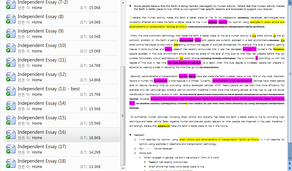 미국 대학 편입 시험을 치르기 위해 토플 성적이 필요했었으나, 로빈 교수님은 저에게 토플을 위한 시험영어를 준비시키지 않으셨습니다. 오히려 일반적인 에세이 작문과 일상 대화 등 근본적인 영어공부를 통해 저의 영어 실력이 향상되도록 도움을 주셨습니다. 제가 글을 쓰면 로빈 교수님이 교정을 해주셨죠. 그렇게 토플 시험공부를 하지 않고 토플 시험에서 73/120점을 받았습니다. University of North Datkoa(노스다코다 주립대학교) 항공운항과가 요구하는 토플 점수가 최소 71점이었고요.