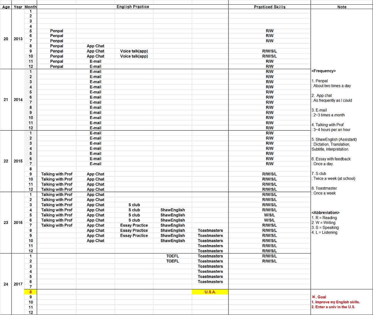 제가 이걸 보여드릴게요. ‘How I Have Studied English’라는 제목으로 제가 그동안 영어를 어떻게 공부했는지 정리한 도표예요. 제가 영어를 공부해온 과정을 기록한 거죠. 여기 이 표는 연도, 월, 나이를 기록한 거고, 이건 제가 무엇을 공부했는지 적어놓은 거예요. 2013년 5월부터 펜팔을 시작했고, 2013년 10월에 입대한 뒤로는 핸드폰을 못 쓰니까 이때부터는 헬렌 교수님과 이메일을 주고받았습니다. 복무 시에는 펜팔은 하루에 2번 정도 메시지를 주고받았고, 제대 후에는 영어 채팅앱을 거의 매일 사용하려고 노력했었습니다. 헬렌 교수님과는 한 달에 1, 2번씩 이메일을 주고받았었죠.