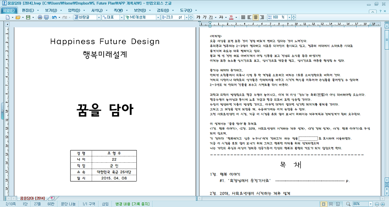 군 생활 21개월 동안, 아버지가 내주었던 한 가지 과제입니다. 10년 동안의 미래를 계획해보는 인생계획서인데 당시 보험회사 미래에셋에서 진행한 ‘행복미래설계 공모전’에 지원해본 겁니다. 제 삶에 목표와 계획을 세울 겸 진지한 태도로 써봤습니다. 이렇게 네 가지 목차가 있는데 첫 번째는 개인·가족 이야기, 두 번째는 재무설계, 세 번째는 장래 설계, 네 번째는 저만의 이야기를 쓰는 것이었습니다.